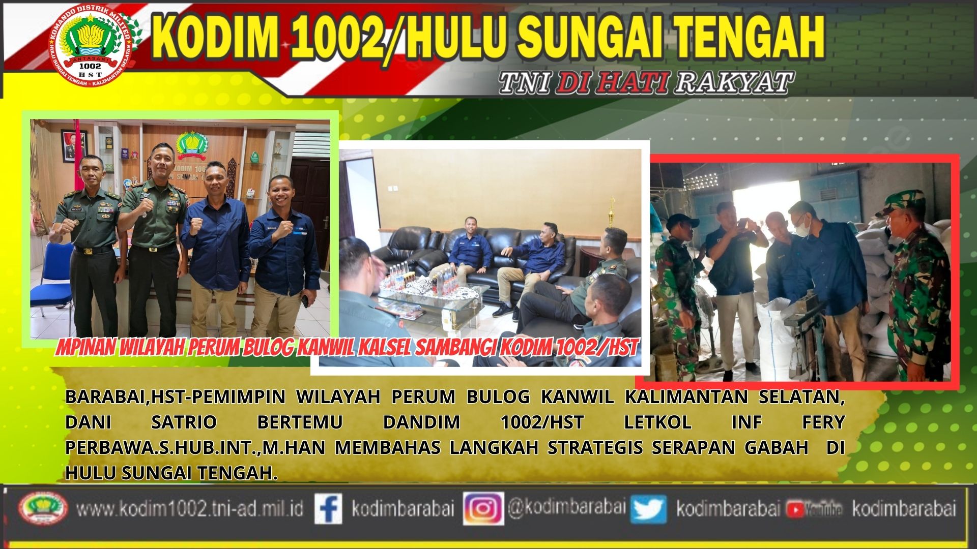Barabai,HST-Pemimpin Wilayah Perum BULOG Kanwil Kalimantan Selatan, Dani Satrio bertemu Dandim 1002/HST Letkol Inf Fery Perbawa.S.Hub.Int.,M.Han membahas langkah strategis ketersediaan stok beras di Hulu Sungai Tengah.