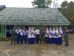 BARABAI-Plh.Danramil 1002-05/Pandawan Peltu Henri Murpianto menjadi Pembina Upacara Pengibaran Bendera Merah Putih di MTsN 9 HST Jalan Mesjid Keramat Desa Palajau Kecamatan Pandawan Kabupaten Hulu Sungai Tengah dilanjutkan Wasbang.Senin (13/02).