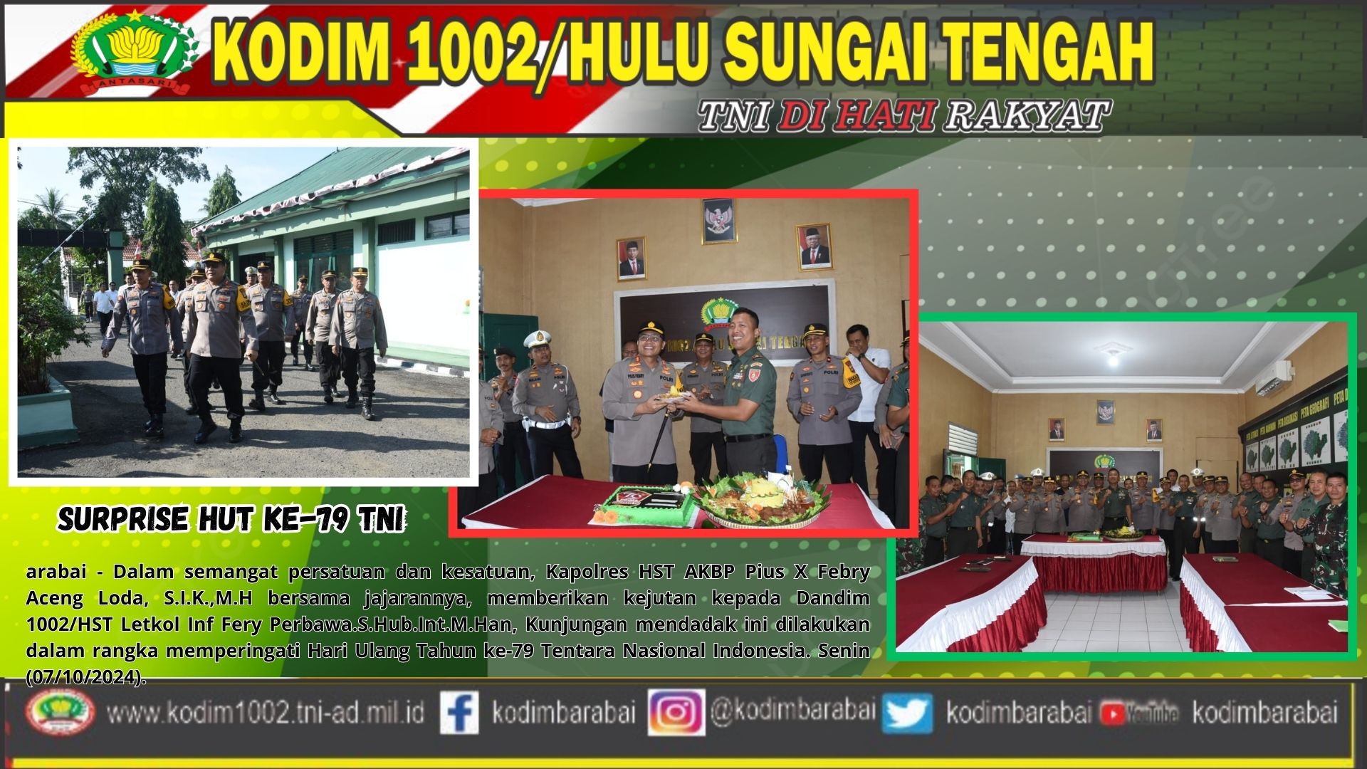 Barabai – Dalam semangat persatuan dan kesatuan, Kapolres Hulu Sungai Tengah (HST) AKBP Pius X Febry Aceng Loda, S.I.K., M.H., beserta jajarannya, memberikan kejutan istimewa kepada Dandim 1002/HST Letkol Inf Fery Perbawa, S.Hub.Int., M.Han, dalam rangka memperingati Hari Ulang Tahun ke-79 Tentara Nasional Indonesia (TNI) pada Senin, 7 Oktober 2024.