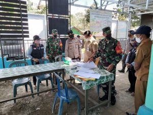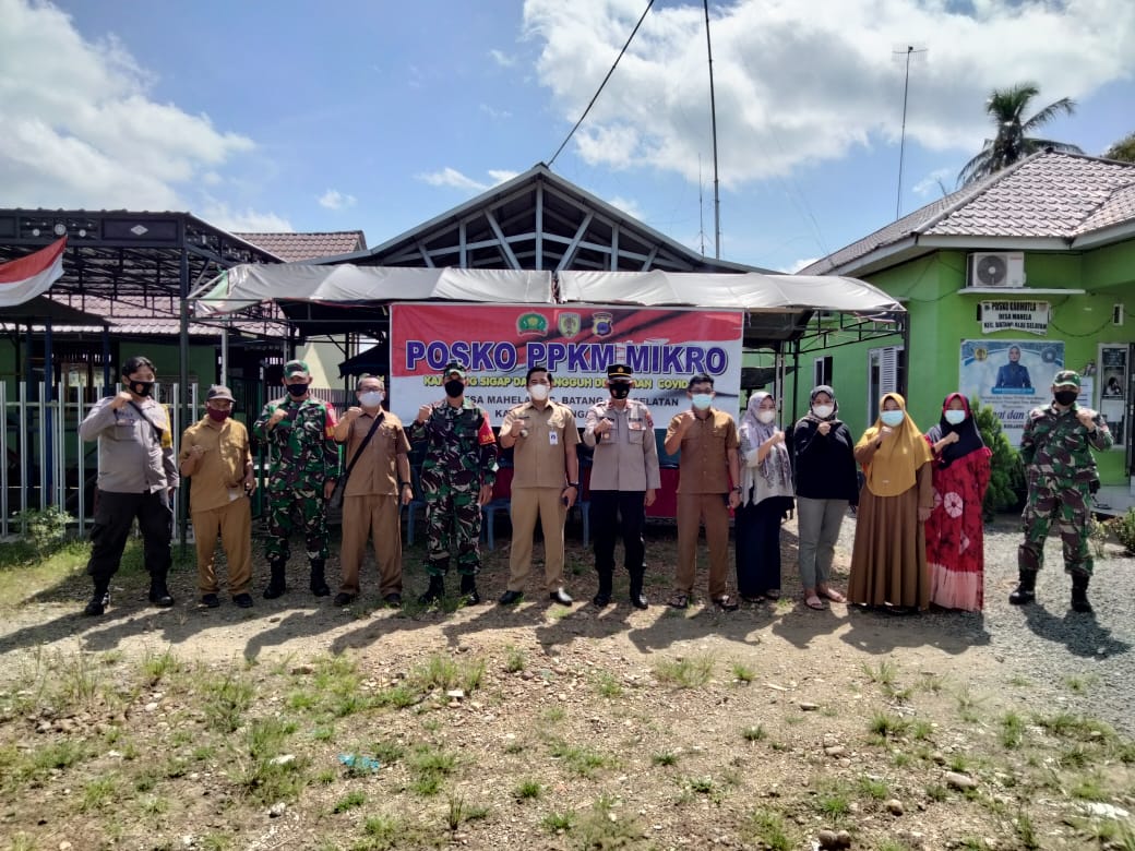 BARABAI-Tiga Pilar Batang Alai Selatan Danramil 1002-01/Birayang Kapten Inf Subhan, Camat BAS Edhy Rahmawan SSTP, MIP, dan Kapolsek Birayang Ipda Erikson meninjau langsung posko PPKM berbasis mikro yang ada di wilayah kecamatan Batang Alai Selatan Kabupaten Hulu Sungai Tengah (HST).Selasa (04/05).
