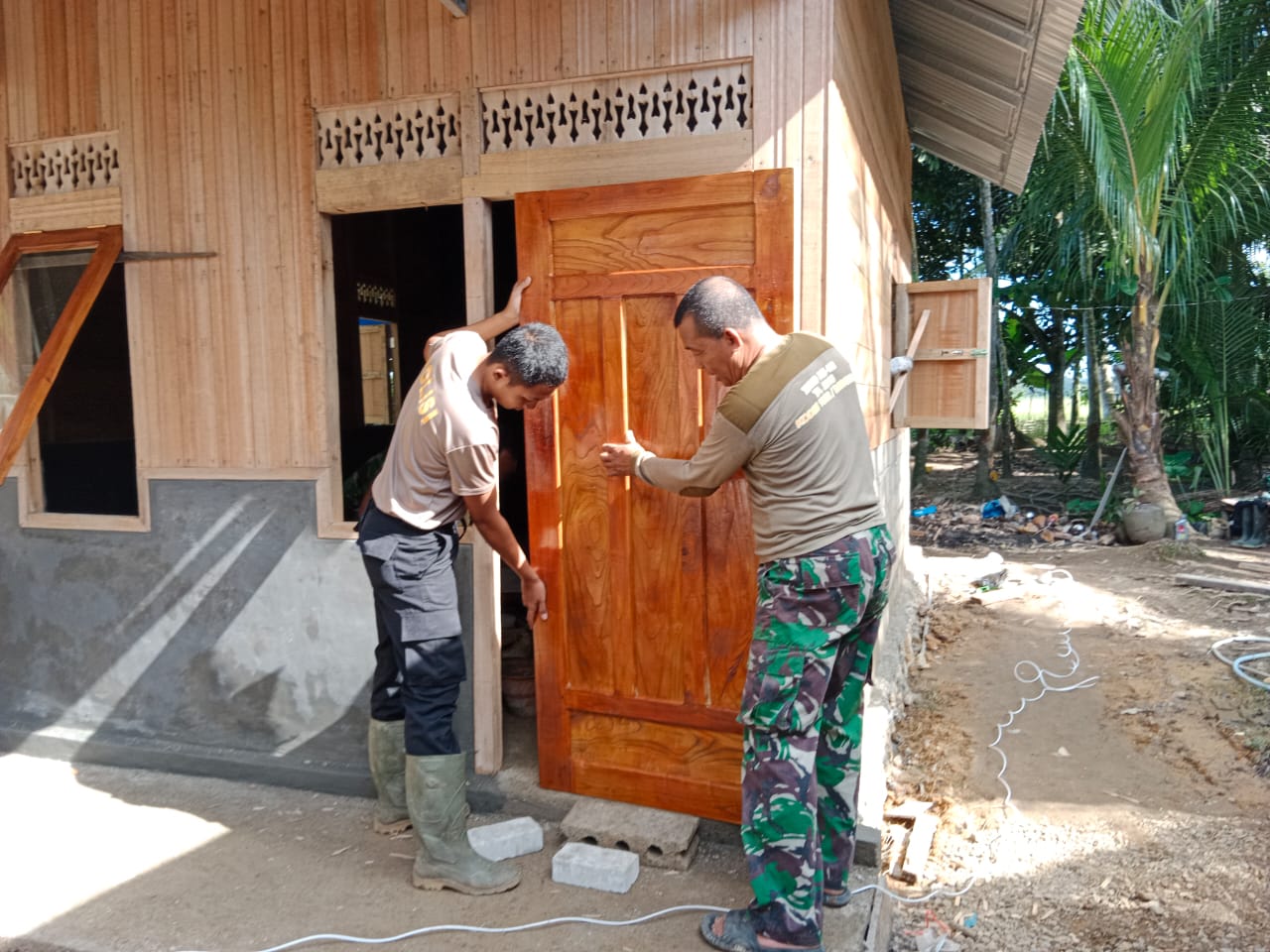 Pantauan pada Kamis (29/5/2025) menunjukkan bahwa pengerjaan rehab RTLH telah memasuki tahap pemasangan pintu rumah. Anggota Satuan Tugas (Satgas) TMMD ke-124 Kodim 1002/HST tampak aktif melaksanakan pemasangan pintu pada salah satu rumah yang menjadi sasaran rehab.
