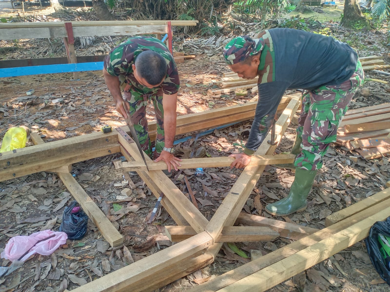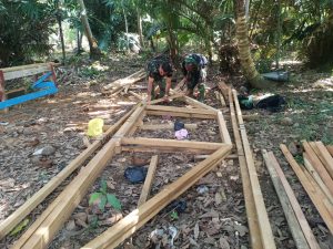 BARABAI-Anggota Kodim 1002/Hulu Sungai Tengah merangkai kuda-kuda guna renovasi Musholla Noor Iman di desa Kasarangan RT.008 RW.003 kec.Labuan Amas Utara Kab.HST.Sabtu (11/09/2021).