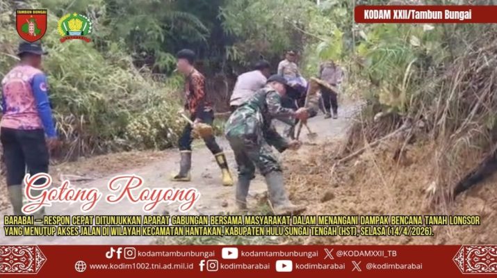 BARABAI – Respon cepat ditunjukkan aparat gabungan bersama masyarakat dalam menangani dampak bencana tanah longsor yang menutup akses jalan di wilayah Kecamatan Hantakan, Kabupaten Hulu Sungai Tengah (HST), Selasa (14/4/2026).