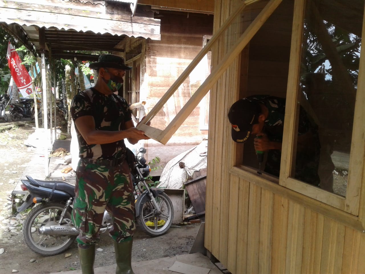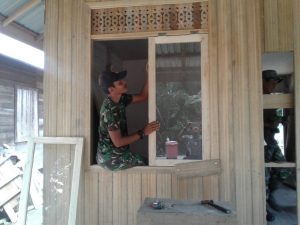 HULU SUNGAI TENGAH-Proses pembangunan Rumah Tidak Layak Huni (RTLH) yang sudah dikerjakan Satgas TNI Manunggal Membangun Desa (Satgas TMMD) Ke-112 Kodim 1002/Hulu Sungai Tengah (HST), setelah selesai mengerjakan pembongkaran, pemasangan dinding kayu, kini rumah milik Rusdi, kali ini proses pemasangan daun pintu dan jendela kaca depan dikerjakan Rabu, (06/10/2021).