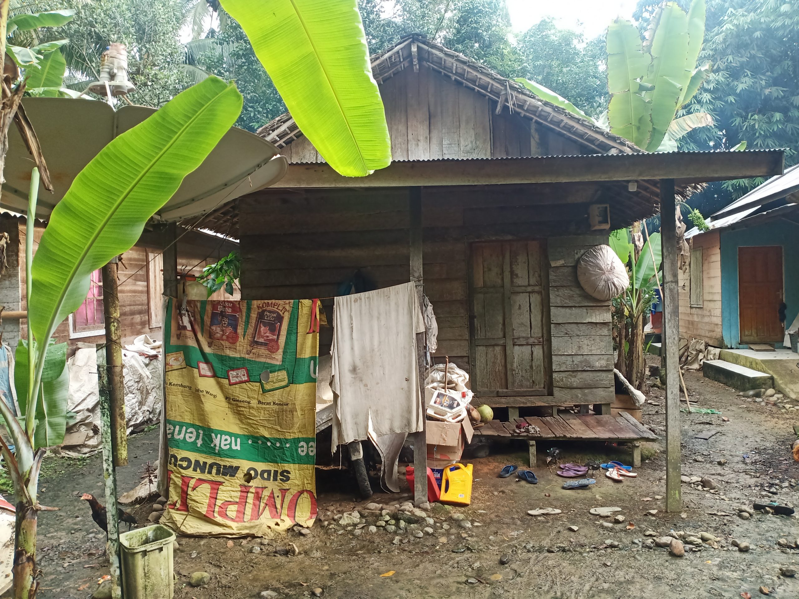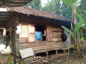 Rumah berukuran 4×6 meter, dinding dan lantai papan serta atap rumah dari daun Rumbiya, banyak mengalami kerusakan karena sudah lapuk dimakan usia.