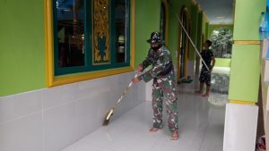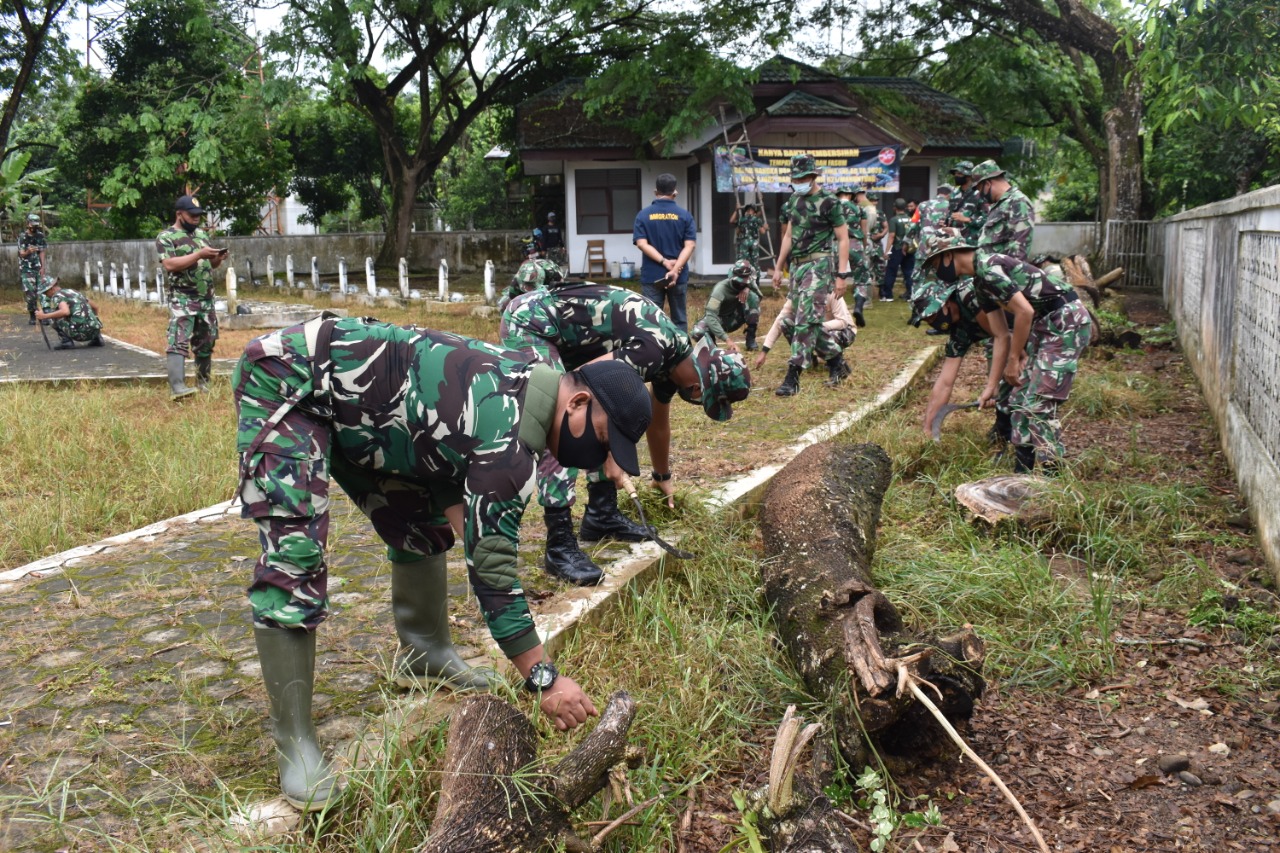 BARABAI-Menyambut Hari Juang TNI AD Tahun 2020 Kodim 1002/Barabai dan Yonif 621/Manuntung melaksanakan pembersihan Taman Makam Pahlawan (TMP) Kusuma Bangsa Pagat Batu Bemawa dan Masjid Al Mubarok desa Pagat Kecamatan Batu Benawa Kabupaten Hulu Sungai Tengah (HST).Sabtu (12/12).