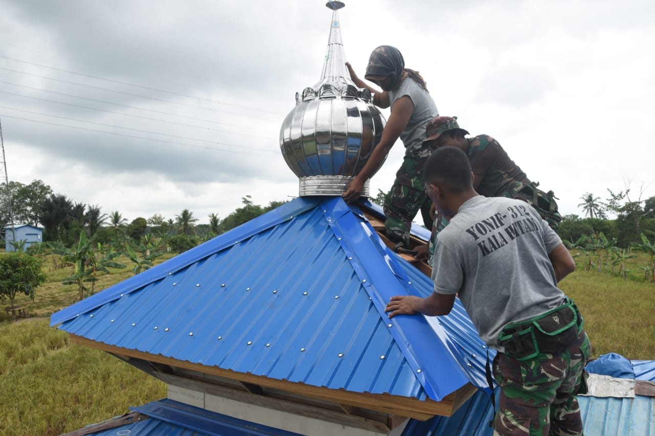 Pantauan pada pagi hari Rabu, 21 Mei 2025, menunjukkan anggota Satgas TMMD tengah melakukan pemasangan kuba kedua pada bangunan langgar Darussalam.