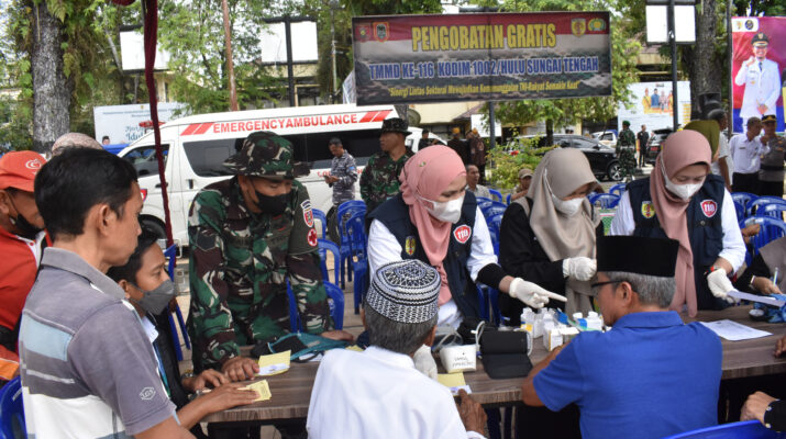 BARABAI-Bekerjasama dengan Dinas Kesehatan Kab. Hulu Sungai Tengah dan Puskes 09.06.15/HST, Satgas TNI Manunggal Membangun Desa (TMM) ke-116 Kodim 1002/HST membuka pengobatan gratis kepada warga masyakat. Kamis, (11/05)