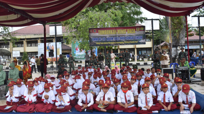 BARABAI-Dalam rangka menyongsong generasi emas 2045, TMMD ke-116 Kodim 1002/HST berkerjasama dengan Dinas Perpustakaan daerah Kab. Hulu Sungai Tengah menggelar minat baca kepada siswa sekolah dasar pada saat upacara pembukaan TMMD. Rabu (10/05).