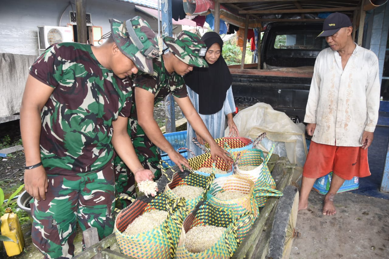 Para anggota Satgas TMMD didampingi oleh warga setempat yang memiliki pengetahuan tentang pengolahan sagu menjadi pakan ternak.