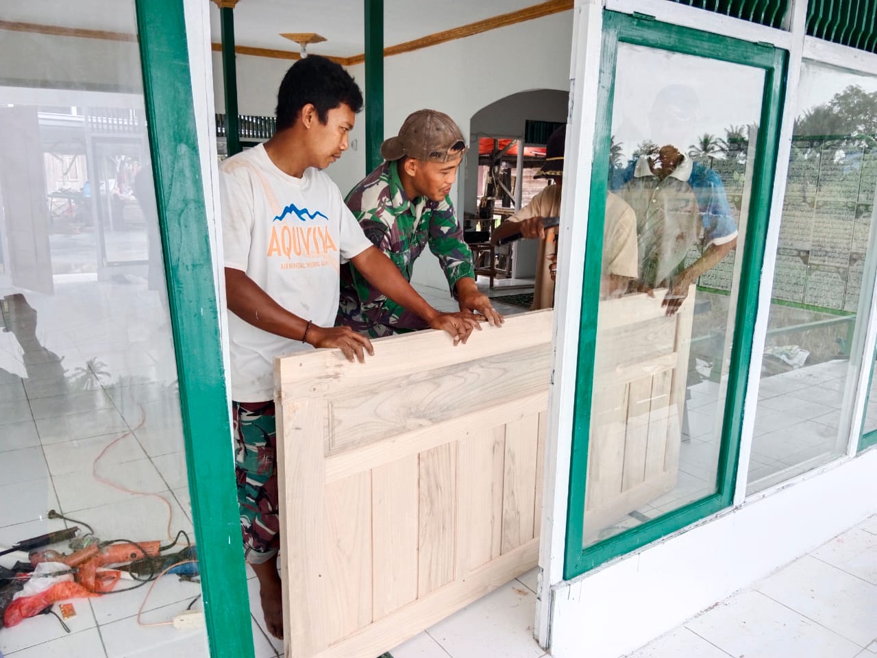 Menjelang penutupan program TMMD, anggota Satgas terlihat tengah melakukan pemasangan dan pengecatan pintu Langgar Darussalam di Kecamatan Haruyan, Senin (02/06).
