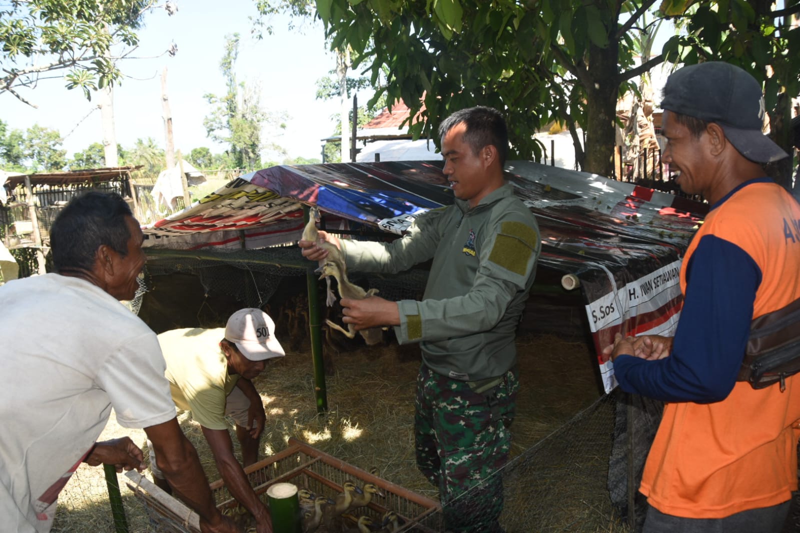 Hal ini terlihat saat anggota Satuan Tugas (Satgas) TNI Manunggal Membangun Desa (TMMD) ke-124 Kodim 1002/Hulu Sungai Tengah menyempatkan diri menyambangi kandang itik milik Bapak Ramaniansyah di RT.002/001 Desa Pengambau Hilir Luar pada Senin (19/5) saat beristirahat siang.