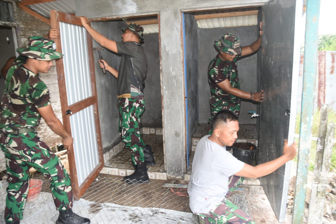 Pada Kamis (22/5), terpantau sejumlah anggota Satgas TMMD sedang fokus pada pemasangan pintu WC Langgar Darussalam.