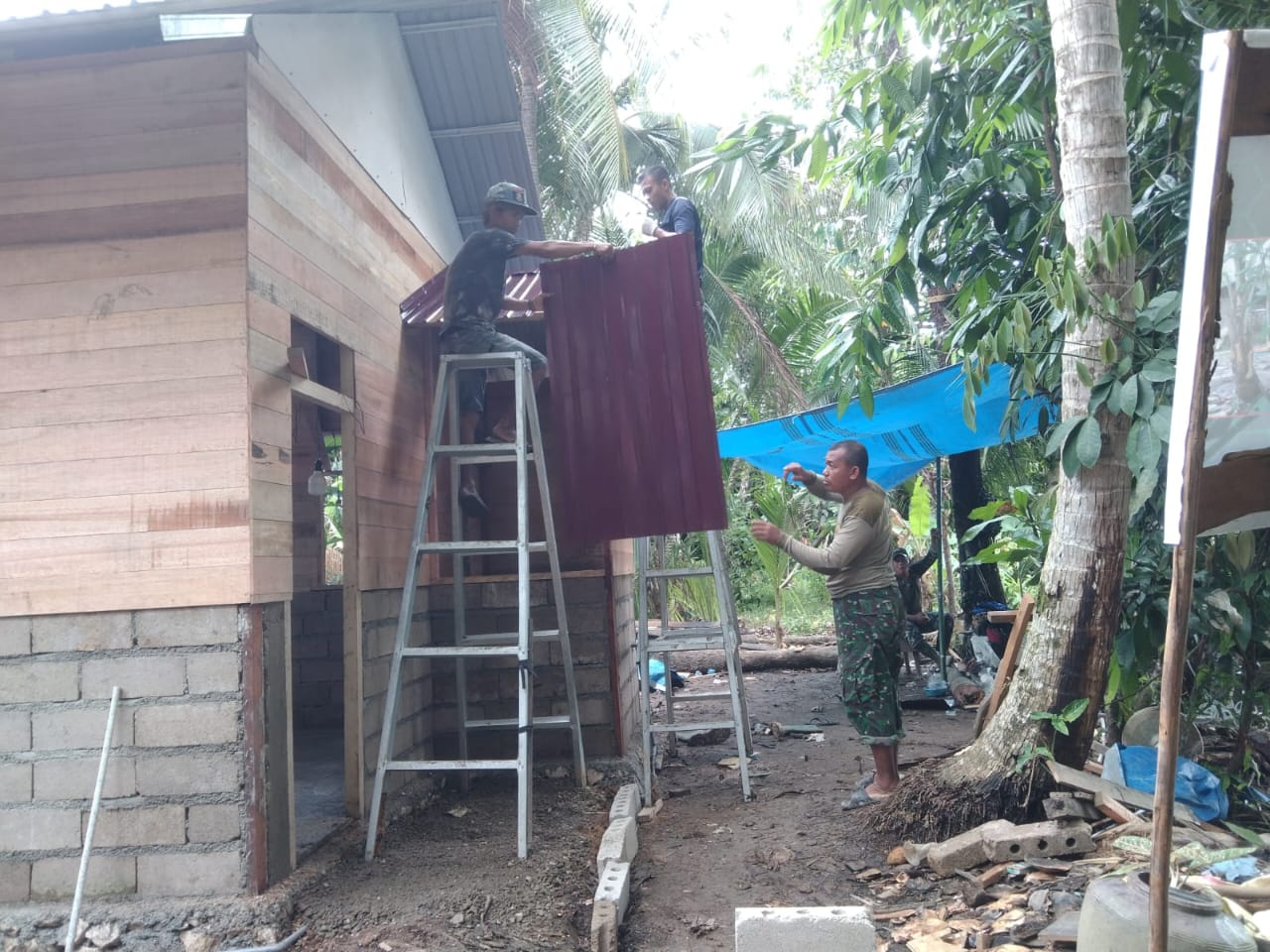 Setelah sebelumnya memasang jendela, pada Sabtu (24/5) sore, anggota Satgas TMMD terpantau tengah memasang atap untuk bagian Mandi Cuci Kakus (MCK) rumah tersebut.