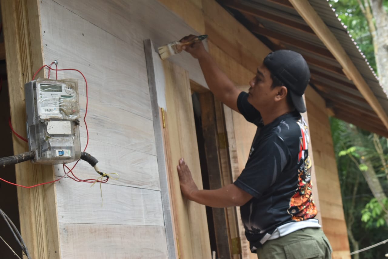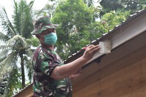 HULU SUNGAI TENGAH-Satgas TMMD ke-112 Kodim 1002/Hulu Sungai Tengah (HST), terlihat semangat sedang mengecat dinding Rumah Tidak Layak Huni (RTLH) milik Rusdi (43) di Desa Rantau Keminting Kecamatan Labuan Amas Utara, Sabtu, (2/10/2021).