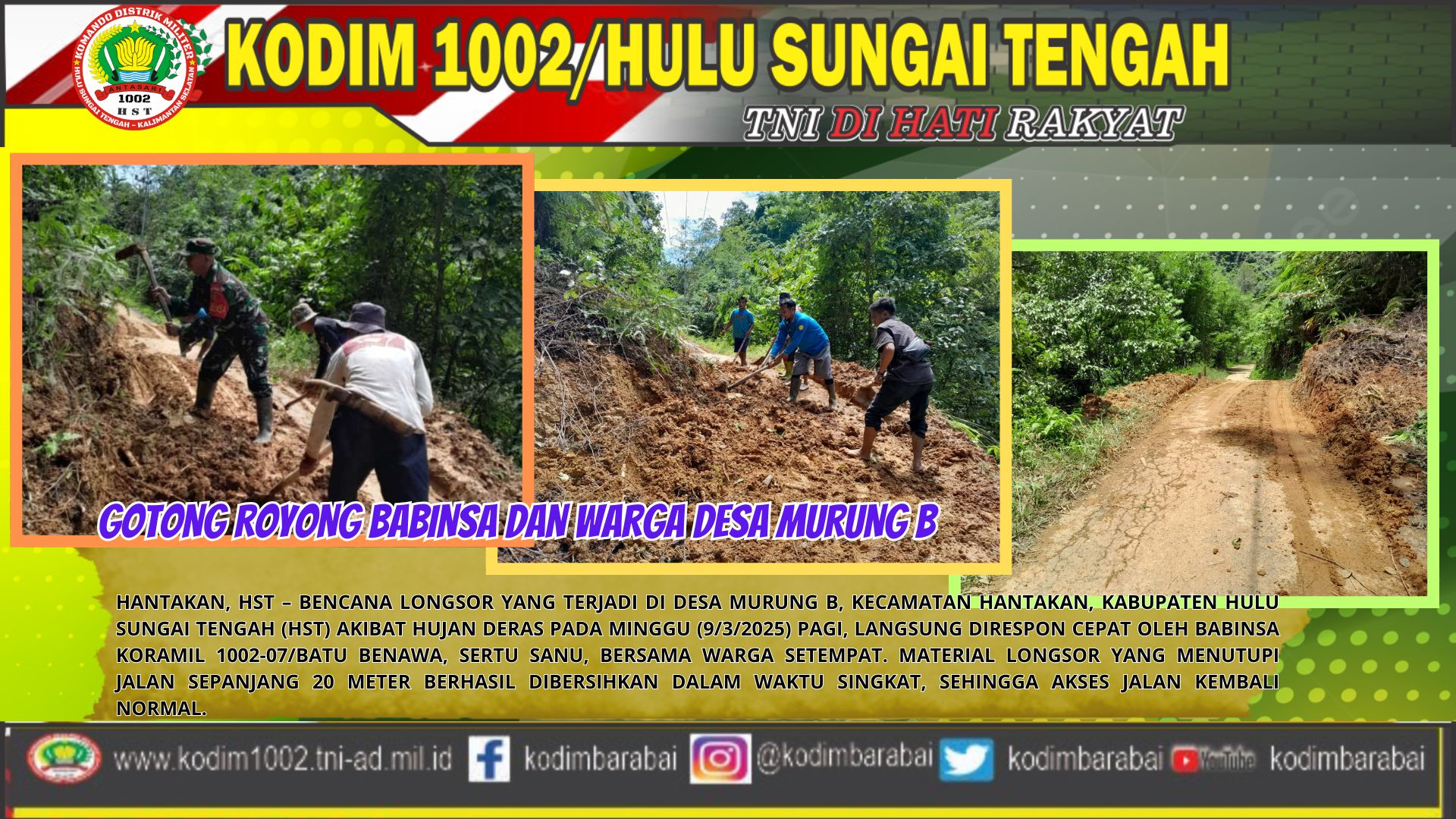 Kejadian longsor ini menjadi pengingat bagi warga Desa Murung B dan sekitarnya untuk selalu waspada terhadap potensi bencana alam, terutama saat musim hujan. Diharapkan, kegiatan gotong royong seperti ini dapat terus dilestarikan sebagai budaya masyarakat Indonesia dalam mengatasi berbagai permasalahan.(pen1002hst).
