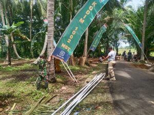 Dalam rangka memeriahkan TMMD ke-112, anggota Tuud Kodim 1002/HST melakukan pasangan umbul-umbul disepanjang jalan masuk ke lokasi TMMD di Desa Rantau Keminting Kec.Labuan Amas Utara Kab.Hulu Sungai Tengah (HST). Senin (06/09/2021).