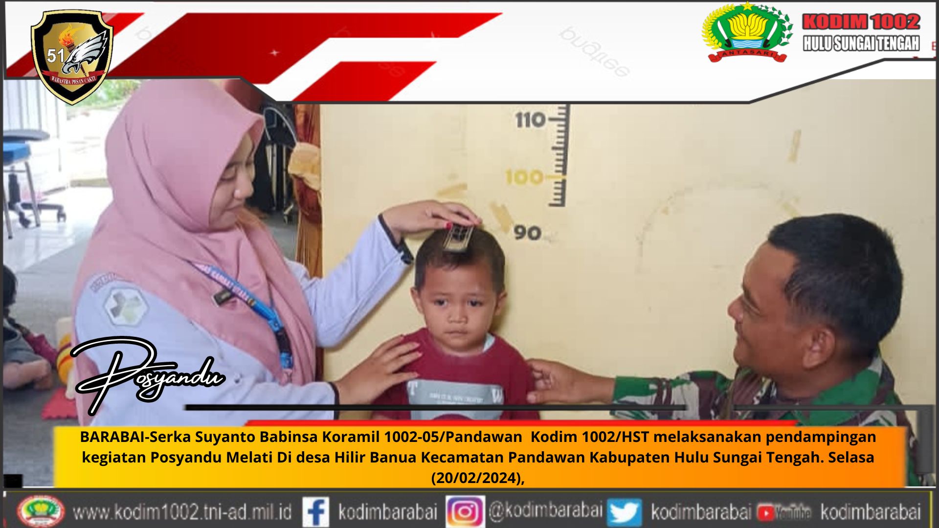 BARABAI-Serka Suyanto Babinsa Koramil 1002-05/Pandawan Kodim 1002/HST melaksanakan pendampingan kegiatan Posyandu Melati Di desa Hilir Banua Kecamatan Pandawan Kabupaten Hulu Sungai Tengah. Selasa (20/02/2024),