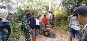 BARABAI-Sertu Nasrul Ekoni Babinsa Koramil 1002-07/Pagat bersama masyarakat melaksanakan gotong royong penimbunan jalan Desa Haliau RT.002 RW.001 Kecamatan Batu Benawa Kabupaten Hulu Sungai Tengah (HST).Selasa (05/01).