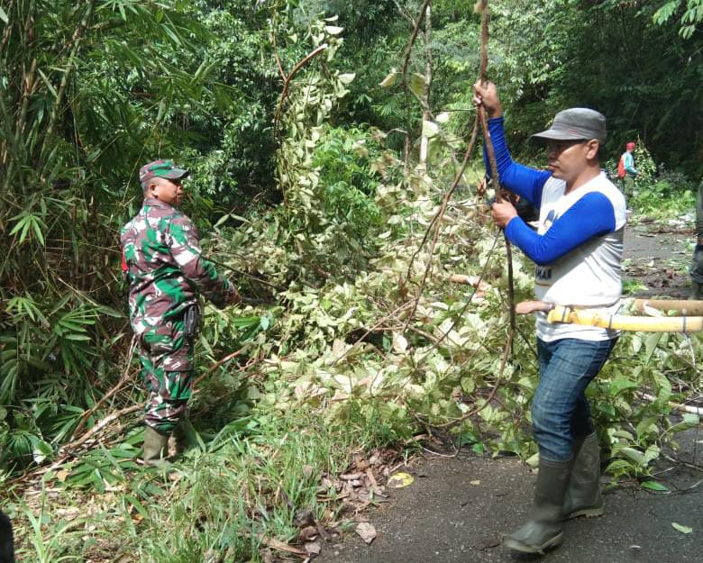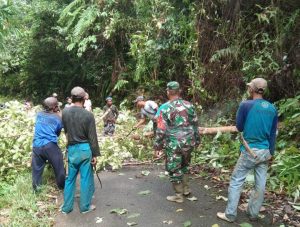 Mendapat laporan ada pohon tumbang di wilayah binaan, sertu Sanu langsung mendatangi ke lokasi pohon tumbang dan bersama-sama warga masyarakat yang sudah ada di lokasi mengevakuasi pohon tersebut.