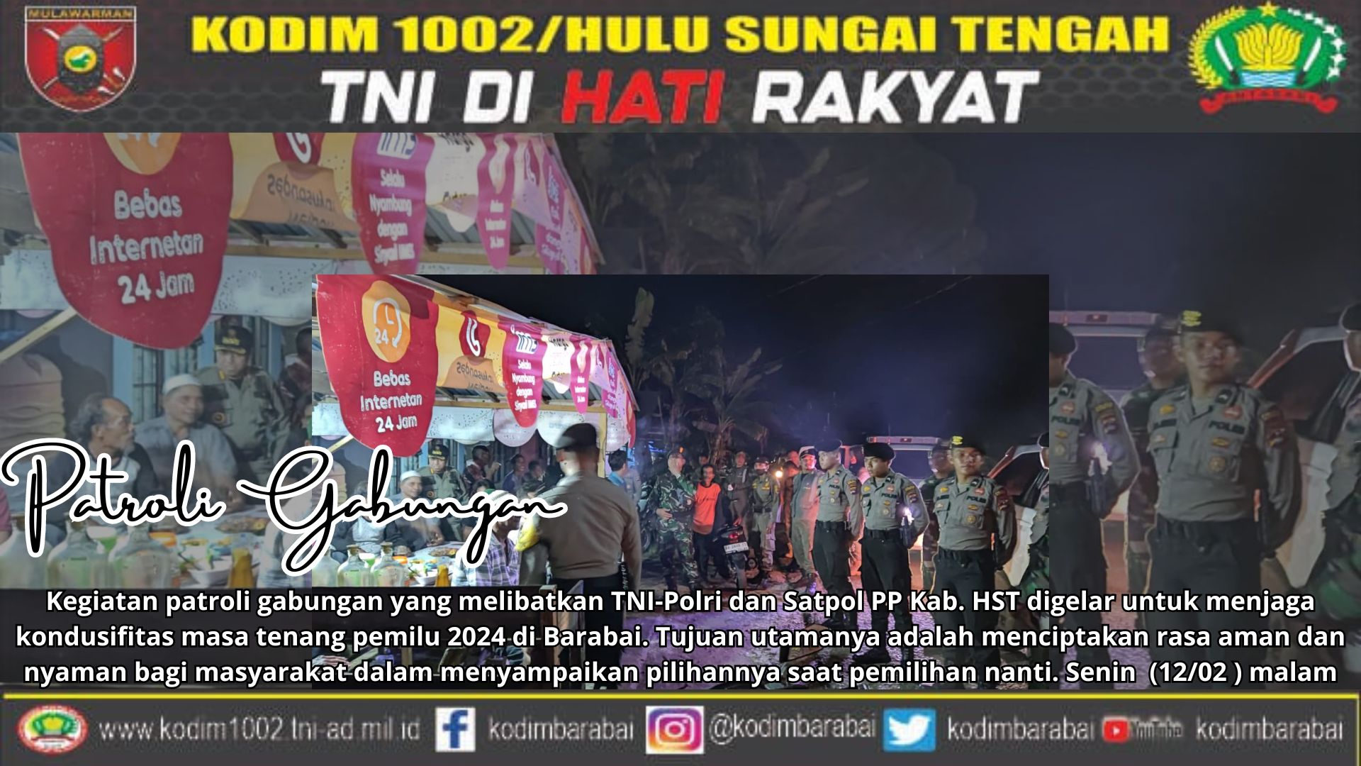 BARABAI- Kegiatan patroli gabungan yang melibatkan TNI-Polri dan Satpol PP Kab. HST digelar untuk menjaga kondusifitas masa tenang pemilu 2024 di Barabai. Tujuan utamanya adalah menciptakan rasa aman dan nyaman bagi masyarakat dalam menyampaikan pilihannya saat pemilihan nanti. Senin (12/02 ) malam