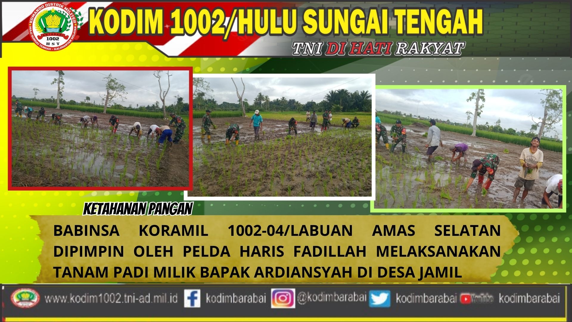 Labuan Amas Selatan, Hulu Sungai Tengah – Anggota Babinsa Koramil 1002-04/Labuan Amas Selatan, Pelda Haris Fadillah, terjun langsung mendampingi petani dalam kegiatan penanaman padi di Desa Jamil, Kecamatan Labuan Amas Selatan, Kabupaten Hulu Sungai Tengah (HST).