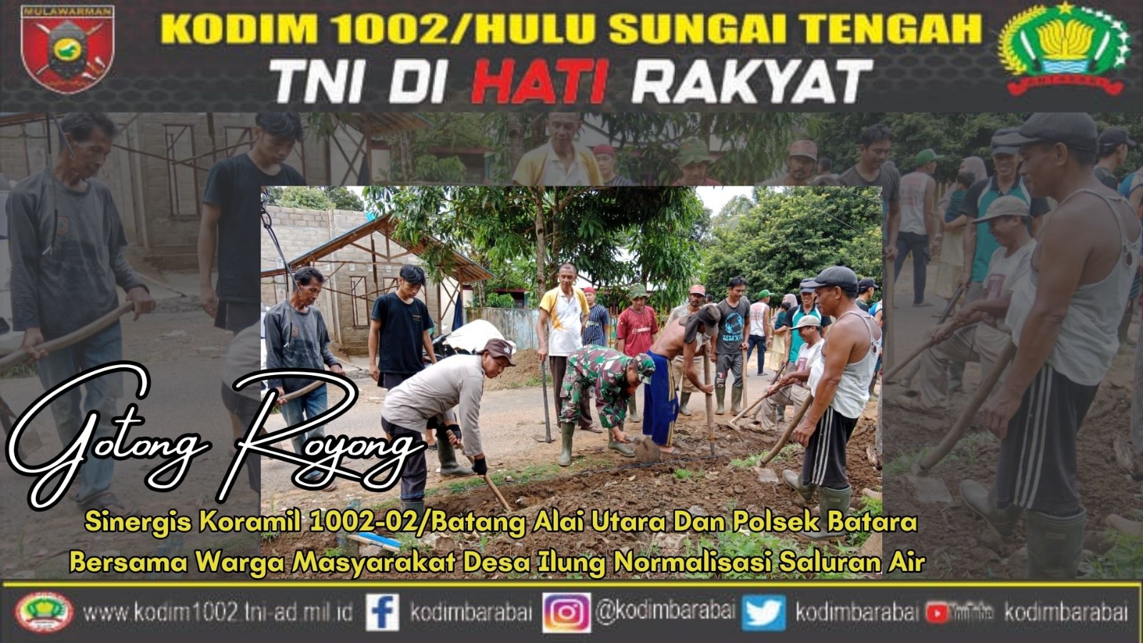 BARABAI-Sinergis Koramil 1002-02/Batang Alai Utara dan Polsek Batara melaksanakan normalisasi parit di desa Ilung Kecamatan Batang Alai Utara Kabupaten Hulu Sungai Tengah. Senin (22/01/2024).