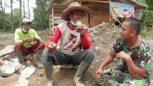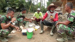 BARABAI – Segelas kopi pengantar obrolan waktu istrirahat anggota Satgas TMMD ke-107 tahun 2020 Kodim 1002/Barabai dengan warga masyarakat, Minggu (05/4).