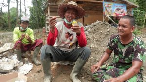 Begitu akrab dan humanis percakapan anggota TNI dengan warga masyarakat melepas lelah sambil menikamati segelas kopi dan kue extrapuding.