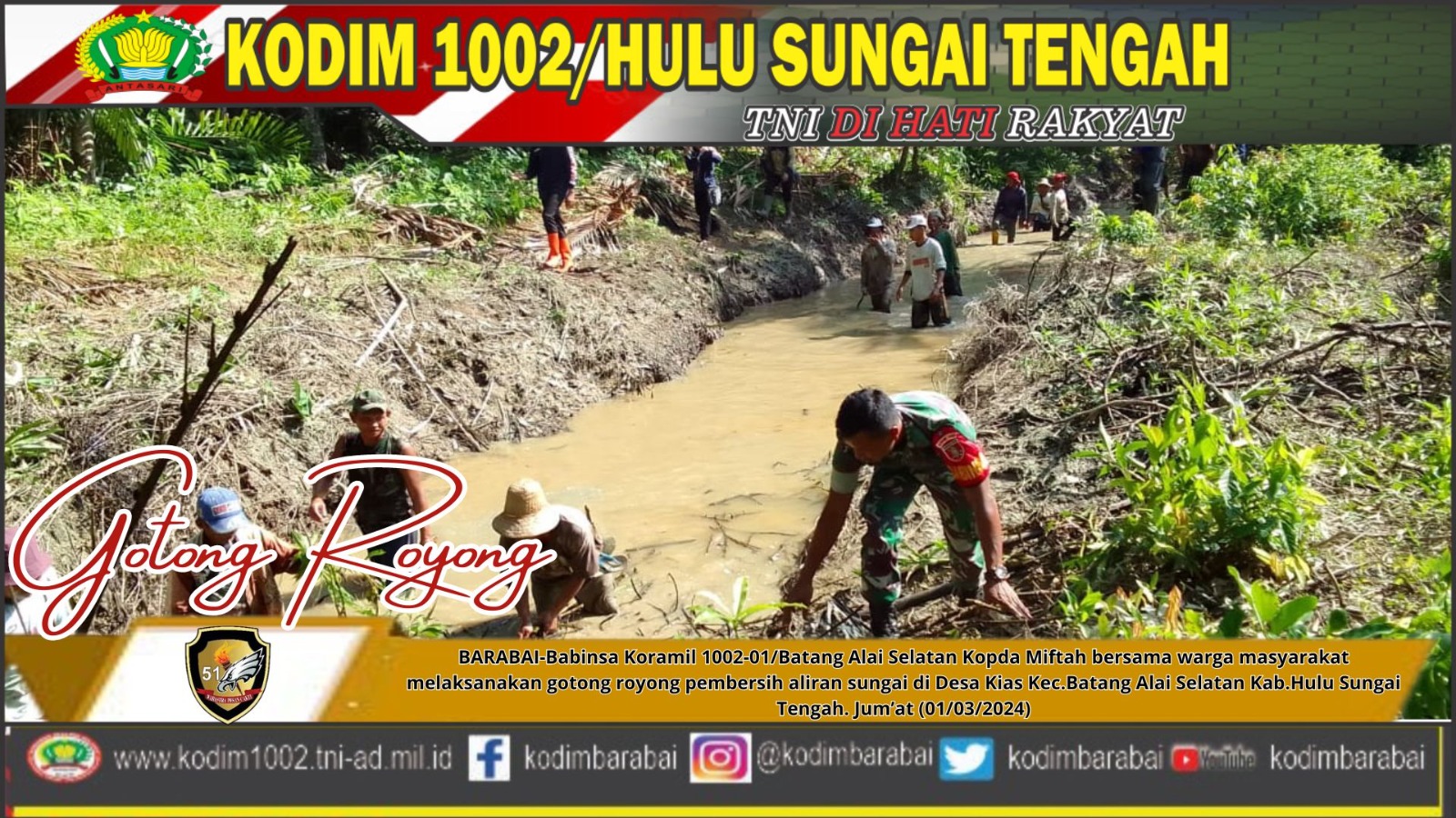 BARABAI-Babinsa Koramil 1002-01/Batang Alai Selatan Kopda Miftah bersama warga masyarakat melaksanakan gotong royong pembersih aliran sungai di Desa Kias Kec.Batang Alai Selatan Kab.Hulu Sungai Tengah. Jum’at (01/03/2024)