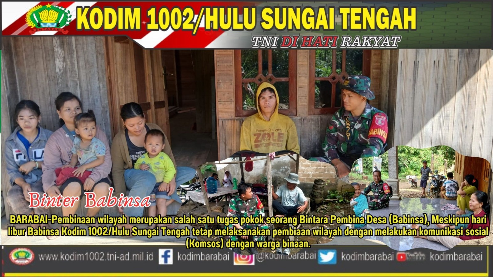 Pembinaan wilayah merupakan salah satu tugas pokok seorang Bintara Pembina Desa (Babinsa), Meskipun hari libur Babinsa Kodim 1002/Hulu Sungai Tengah tetap melaksanakan pembiaan wilayah