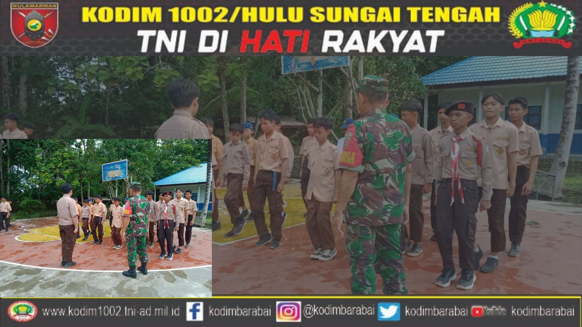 BARABAI-Babinsa Koramil 1002-04/Labuan Amas Selatan Serma Haris Fadillah memberikan pelatihan PBB dan Pramuka di SMPN 6 HST Kec.Labuan Amas Selatan Kab.Hulu Sungai Tengah. Sabtu