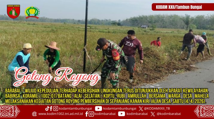BARABAI – Wujud kepedulian terhadap kebersihan lingkungan terus ditunjukkan oleh aparat kewilayahan. Babinsa Koramil 1002-01/Batang Alai Selatan, Koptu Rubi Amrullah bersama warga Desa Mahela