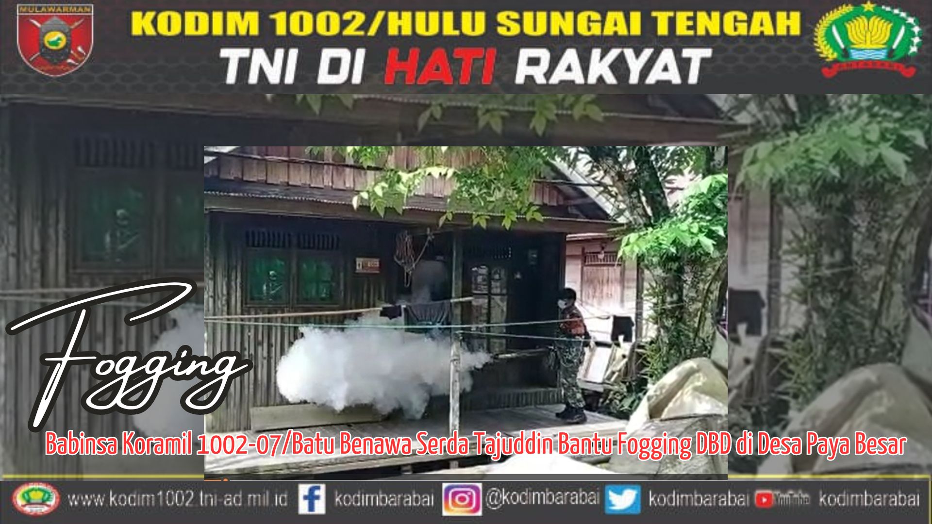 BARABAI-Babinsa Koramil 1002-07/Batu Benawa Serda Tajuddin bersama pertugas kesehatan Puskesmas Kalibaru melaksanakan fogging di desa Paya Besar Kecamatan Batu Benawa Kabupaten Hulu Sungai Tengah.