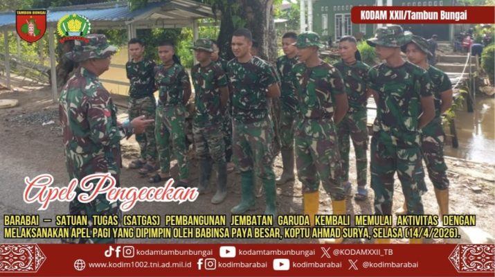 BARABAI – Satuan Tugas (Satgas) pembangunan Jembatan Garuda kembali memulai aktivitas dengan melaksanakan apel pagi yang dipimpin oleh Babinsa Paya Besar, Koptu Ahmad Surya,