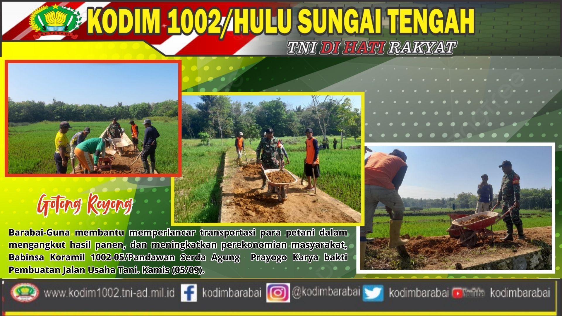 Barabai-Guna membantu memperlancar transportasi para petani dalam mengangkut hasil panen, dan meningkatkan perekonomian masyarakat, Babinsa Koramil 1002-05/Pandawan Serda Agung Prayogo Karya bakti Pembuatan Jalan