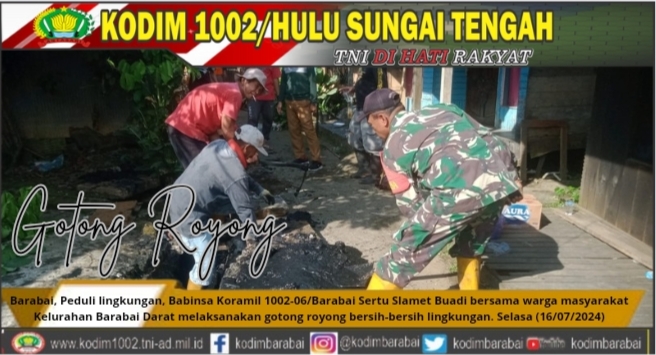Barabai– Sebagai bentuk kepedulian terhadap lingkungan, Babinsa Koramil 1002-06/Barabai, Sertu Slamet Buadi, bersama warga masyarakat Kelurahan Barabai Darat melaksanakan gotong royong membersihkan lingkungan pada