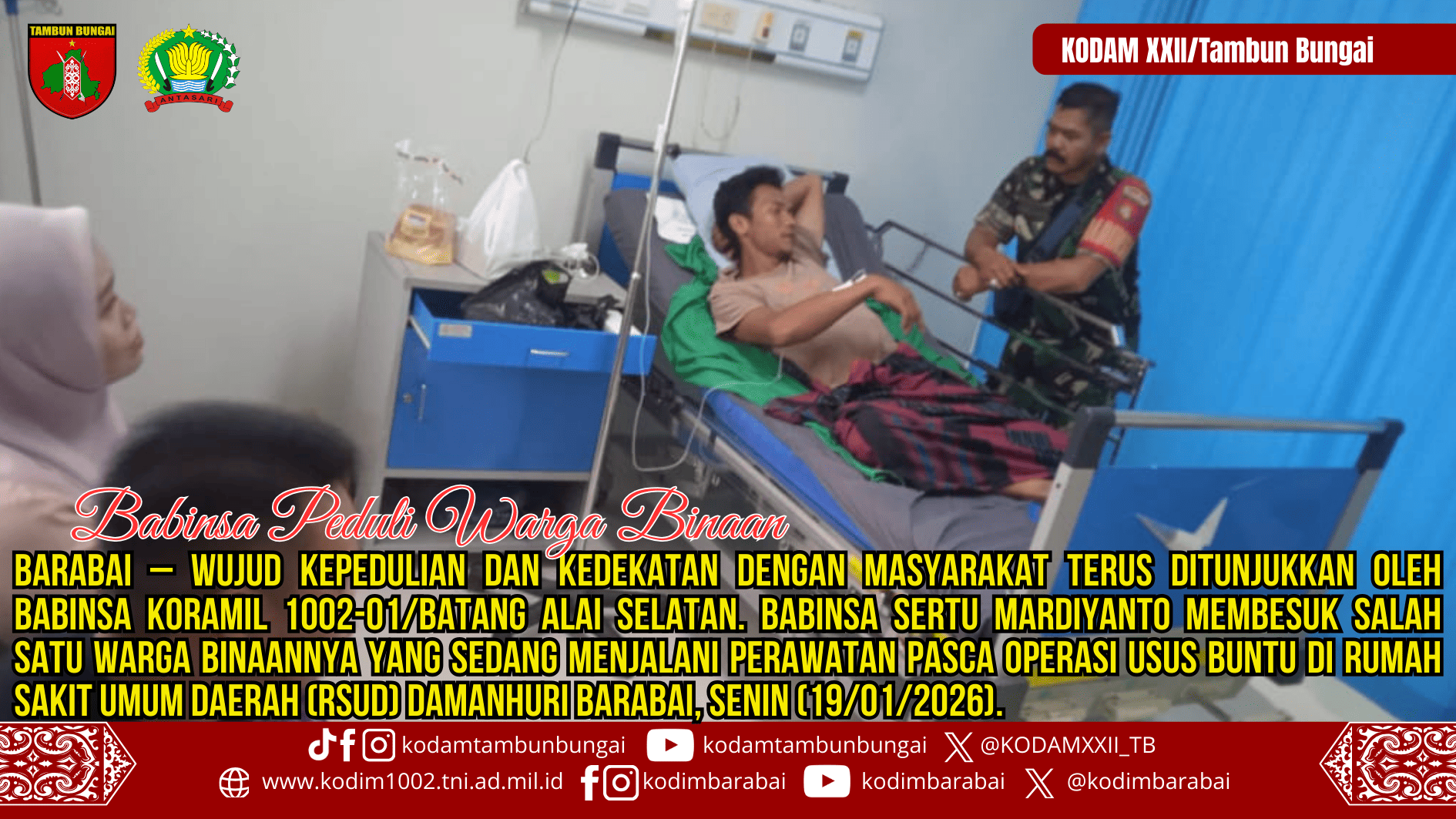 BARABAI – Wujud kepedulian dan kedekatan dengan masyarakat terus ditunjukkan oleh Babinsa Koramil 1002-01/Batang Alai Selatan. Babinsa Sertu Mardiyanto membesuk salah satu warga binaan