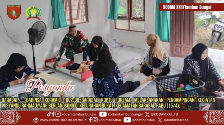 BARABAI – Babinsa Koramil 1002-06/Barabai, Koptu Furzam, melaksanakan pendampingan kegiatan Posyandu Rahmad yang berlangsung di Kelurahan Bukat, Kecamatan Barabai, Rabu (15/4). Kegiatan pendampingan ini