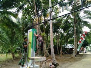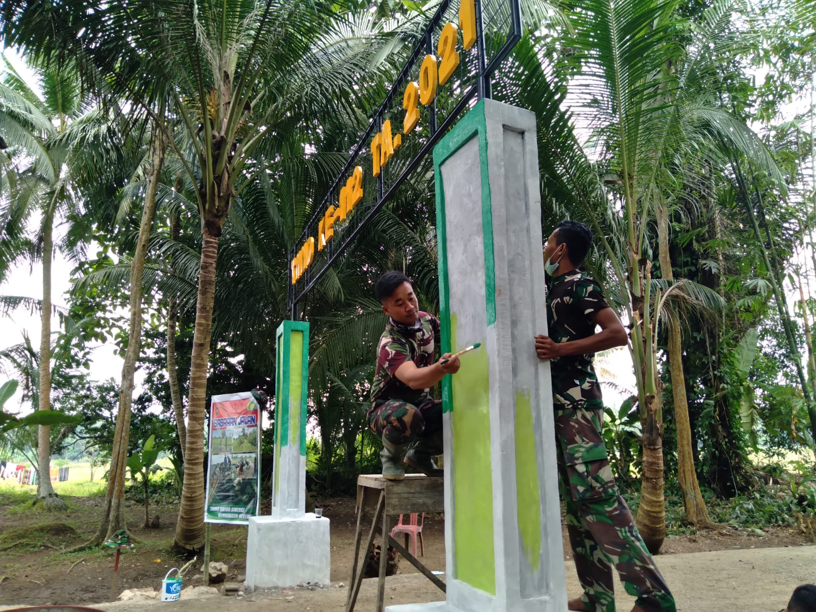 BARABAI-Gapura sebagai penanda TMMD pernah dilaksanakan di Desa Rantau Keminting, Kecamatan Labuan Amas Utara telah berdiri Kokoh, Satgas TMMD Ke-112 Kodim 1002/Hulu Sungai Tengah (HST) lanjutkan tahap finishing dengan melakukan pengecatan. Jumat, (8/10/2021).