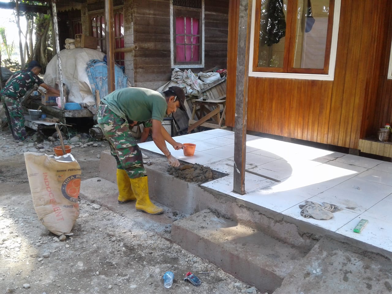Dikatakan oleh Peltu Riyanto, yang sedang melaksanakan pekerjaan rumah tersebut, bahwa pemasangan keramik hari ini masih dalam tahap pengerjaan dibagian teras rumah.