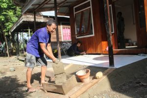 HULU SUNGAI TENGAH.-Saat ini rumah RTLH milik Rusdi (43) yang terletak di Desa Rantau Keminting, Kecamatan Labuan Amas Utara, dalam pengerjaannya memasuki tahap finishing menyisakan pemasangan keramik teras, Sabtu, (9/10/2021).