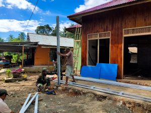 HULU SUNGAI TENGAH- Satgas TMMD ke-112 Kodim 1002/Hulu Sungai Tengah (HST) mulai mengerjakan perakitan rangka baja ringan yang akan dipasang untuk teras mushola Noor Iman.