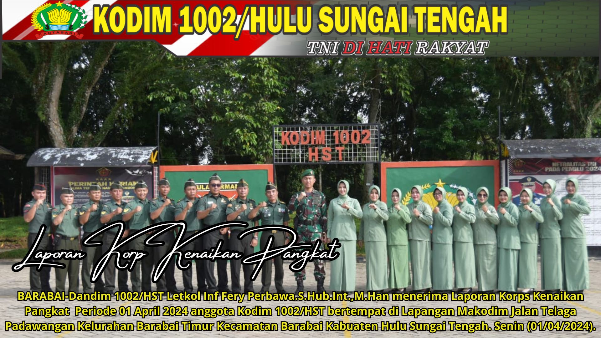 BARABAI-Dandim 1002/HST Letkol Inf Fery Perbawa.S.Hub.Int.,M.Han menerima Laporan Korps Kenaikan Pangkat Periode 01 April 2024 anggota Kodim 1002/HST bertempat di Lapangan Makodim Jalan Telaga Padawangan Kelurahan Barabai Timur Kecamatan Barabai Kabuaten Hulu Sungai Tengah. Senin (01/04/2024).