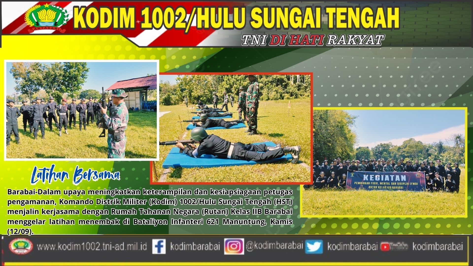 Barabai-Dalam upaya meningkatkan keterampilan dan kesiapsiagaan petugas pengamanan, Komando Distrik Militer (Kodim) 1002/Hulu Sungai Tengah (HST) menjalin kerjasama dengan Rumah Tahanan Negara (Rutan) Kelas IIB Barabai menggelar latihan menembak di Bataliyon Infanteri 621 Manuntung, Kamis (12/09).
