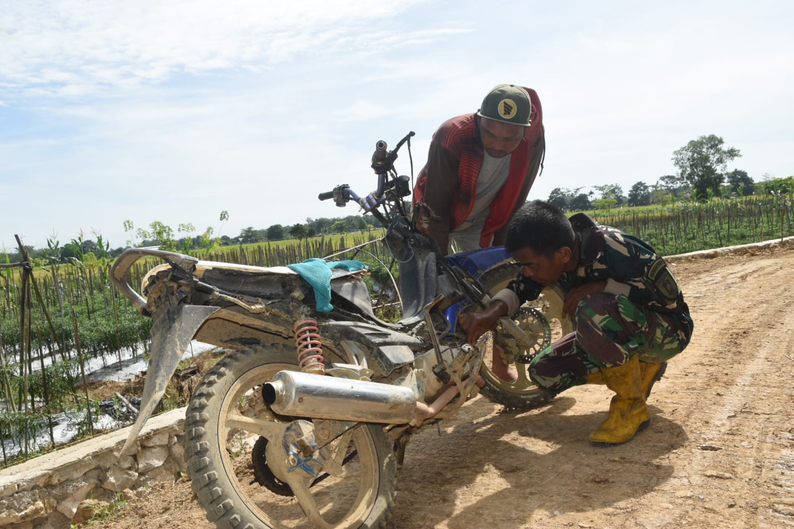 Aksi spontan ini terjadi di sela-sela kegiatan TMMD. Melihat seorang warga kesulitan dengan sepeda motornya yang mogok, anggota Satgas TMMD tanpa ragu menghampiri dan memberikan bantuan. Dengan bekal pengetahuan dan peralatan seadanya, mereka berusaha memperbaiki kerusakan agar kendaraan warga tersebut dapat kembali berfungsi.