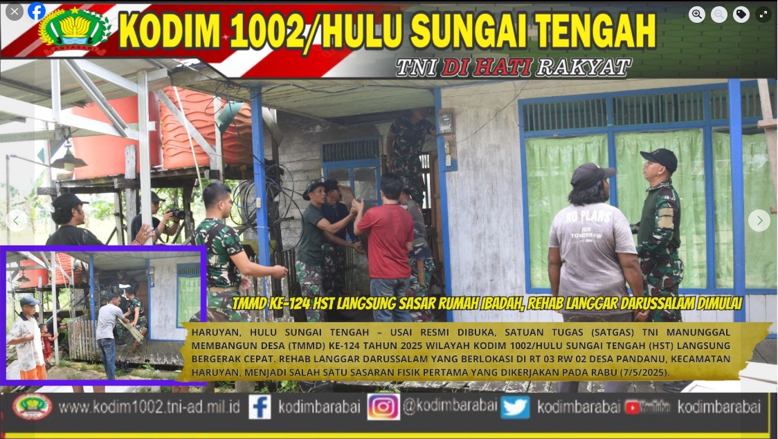 HARUYAN, HULU SUNGAI TENGAH – Usai resmi dibuka, Satuan Tugas (Satgas) TNI Manunggal Membangun Desa (TMMD) ke-124 tahun 2025 wilayah Kodim 1002/Hulu Sungai Tengah (HST) langsung bergerak cepat. Rehab Langgar Darussalam yang berlokasi di RT 03 RW 02 Desa Pandanu, Kecamatan Haruyan, menjadi salah satu sasaran fisik pertama yang dikerjakan pada Rabu (7/5/2025).