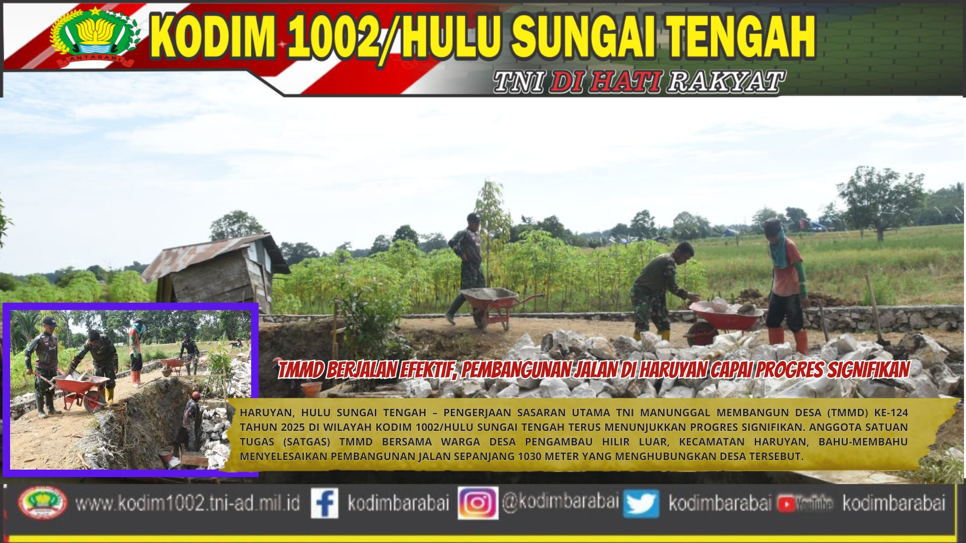 “Pengerjaan jalan sepanjang 1030 meter yang menghubungkan Desa Pengambau Hilir Luar Kecamatan Haruyan ini sudah dikerjakan semenjak kegiatan Pra TMMD,” terang Lettu Czi M. Singgih pada Kamis (8/5/2025).