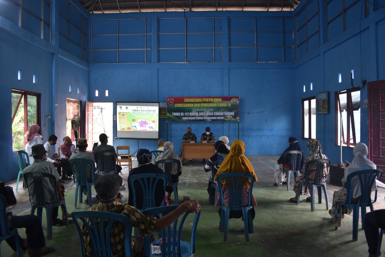 BARABAI- Memasuki Hari ke-20 pelaksanaan TNI Manunggal Membangun Desa (TMMD) ke-112 Kodim 1002/Hulu Sungai Tengah di Desa Rantau Keminting kec.Labuan Mas Utara Kab.HST dilaksanakan penyuluan tentang pencegahan dan penularan covid-19.