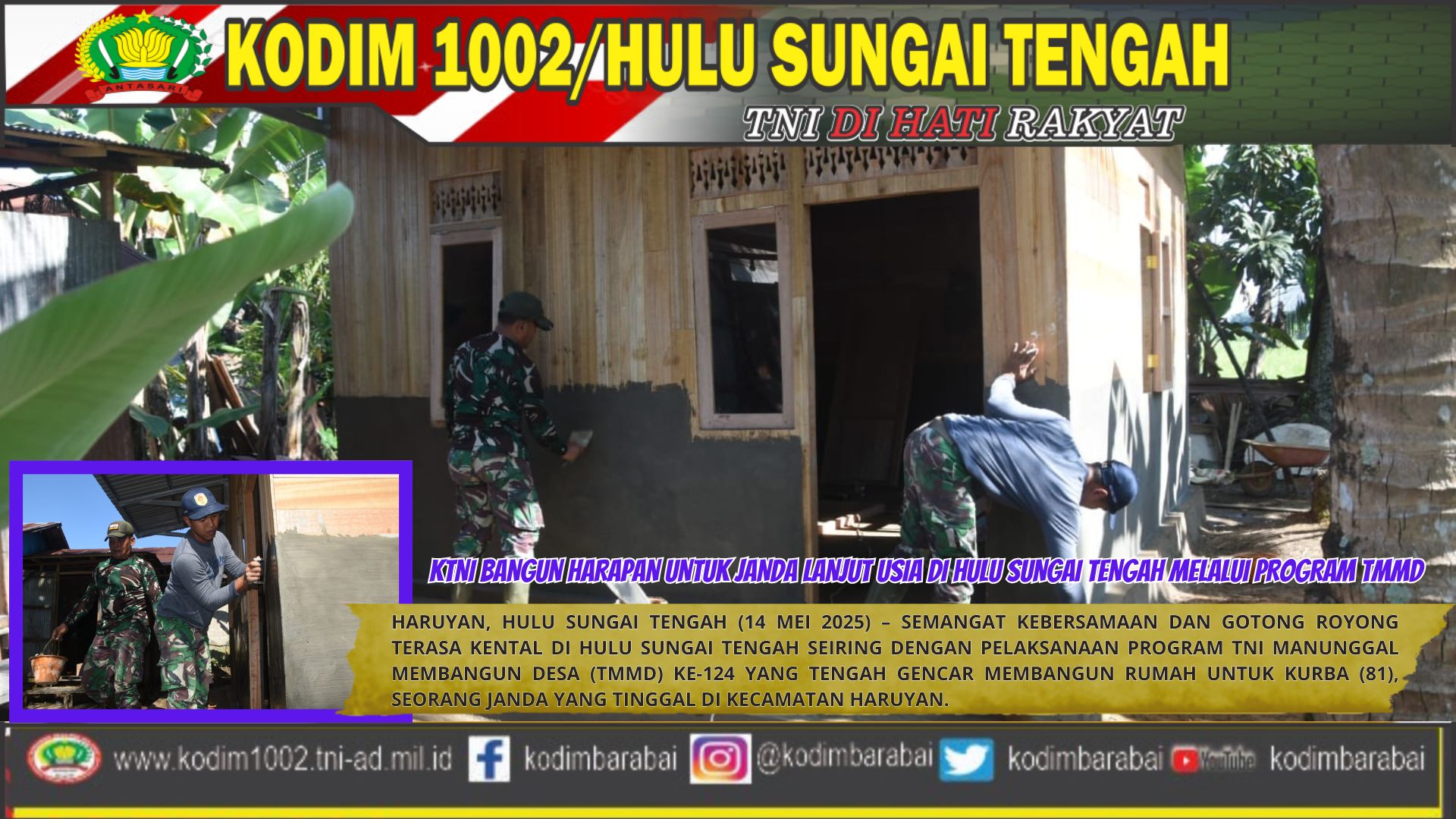 HARUYAN, HULU SUNGAI TENGAH (14 Mei 2025) – Semangat kebersamaan dan gotong royong terasa kental di Hulu Sungai Tengah seiring dengan pelaksanaan program TNI Manunggal Membangun Desa (TMMD) ke-124 yang tengah gencar membangun rumah untuk Kurba (81), seorang janda yang tinggal di Kecamatan Haruyan.